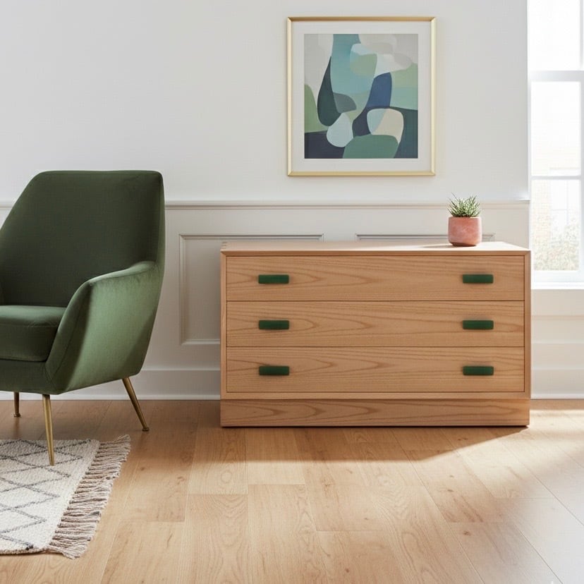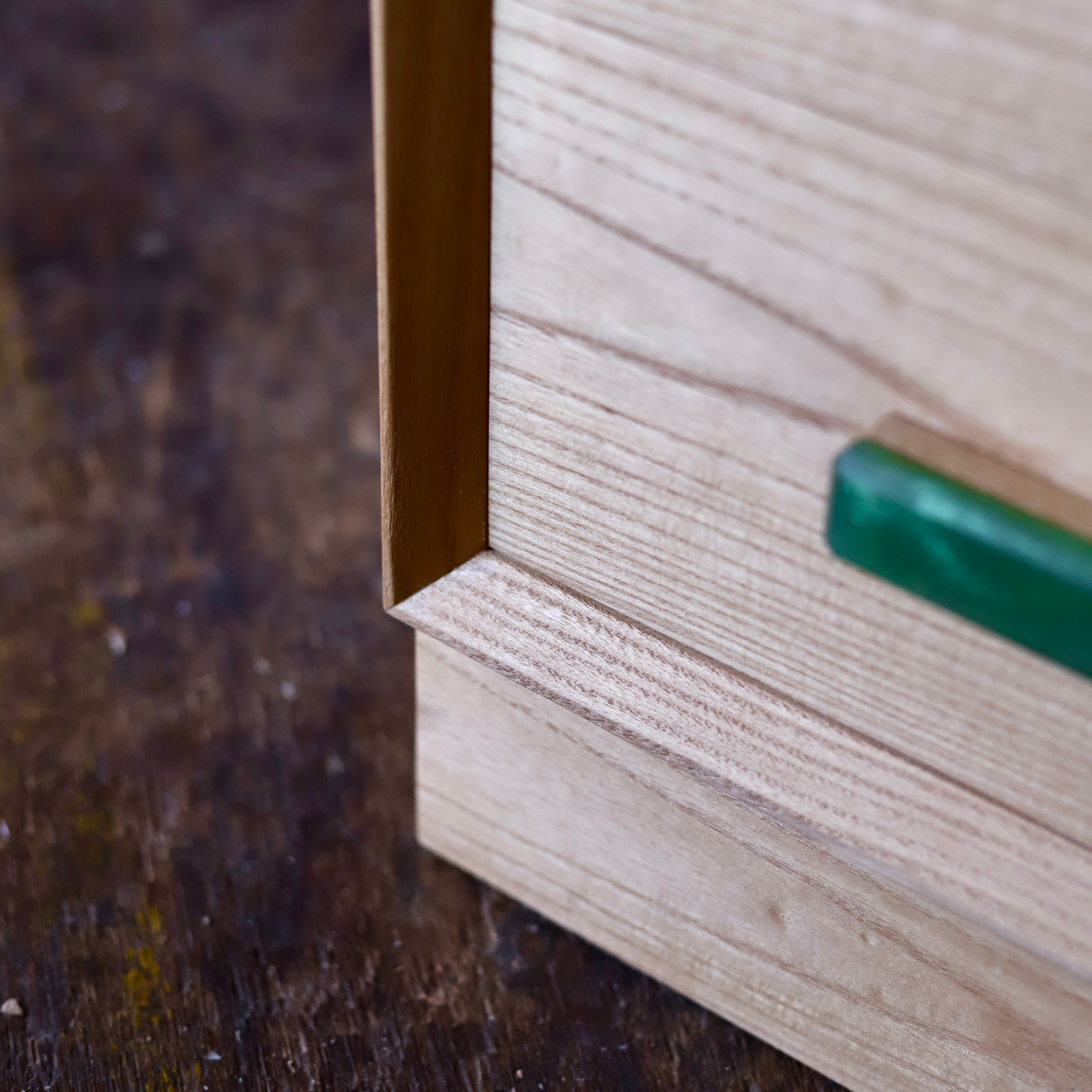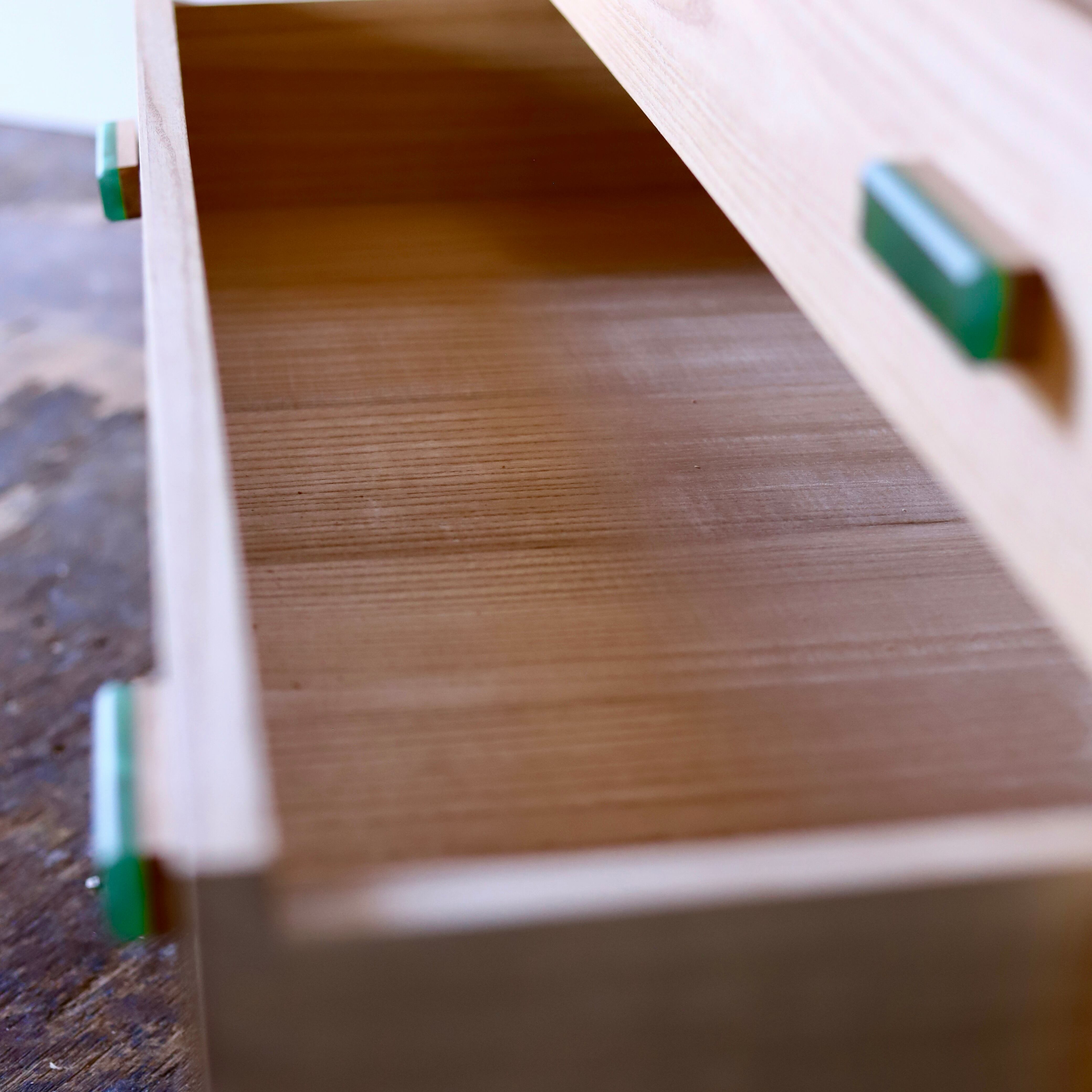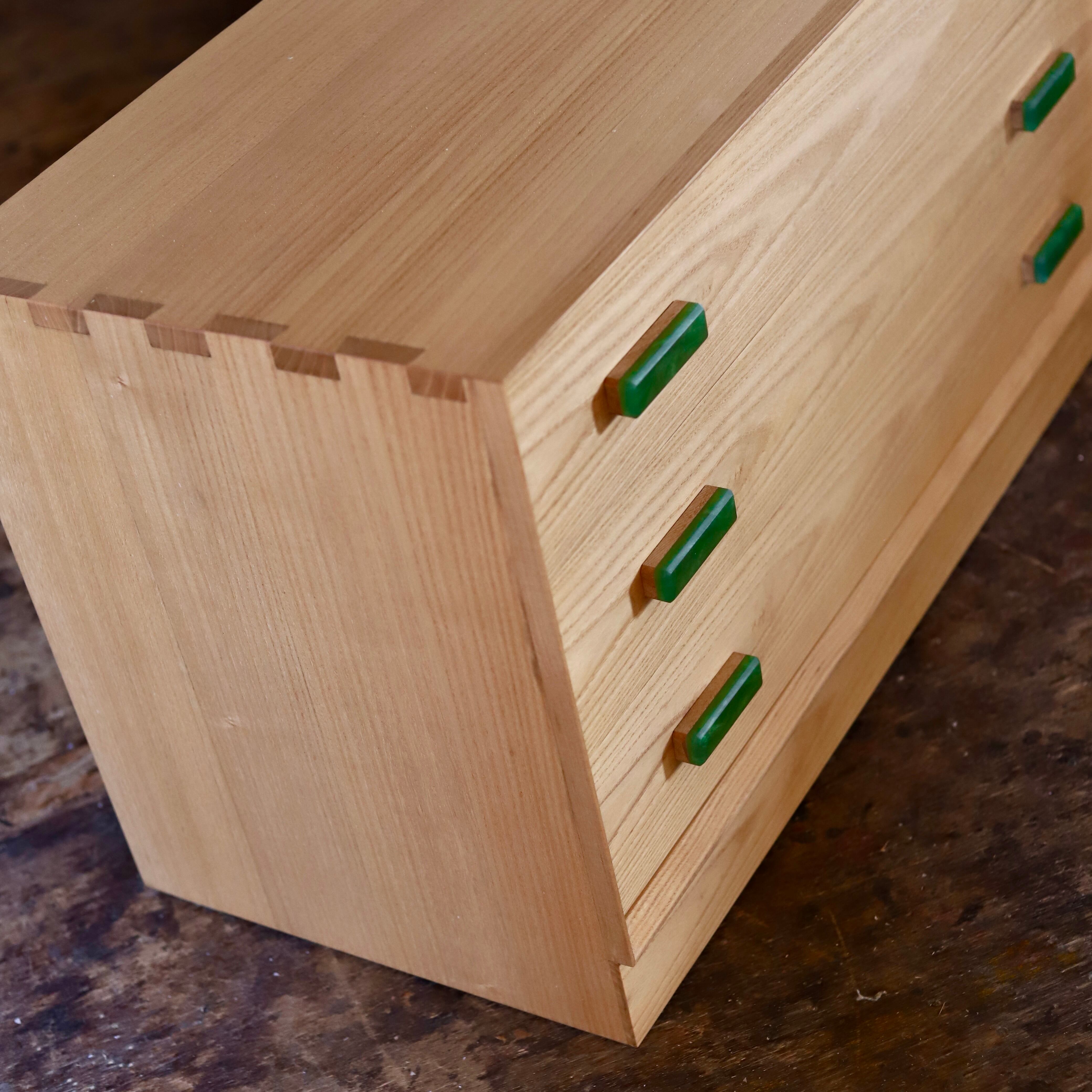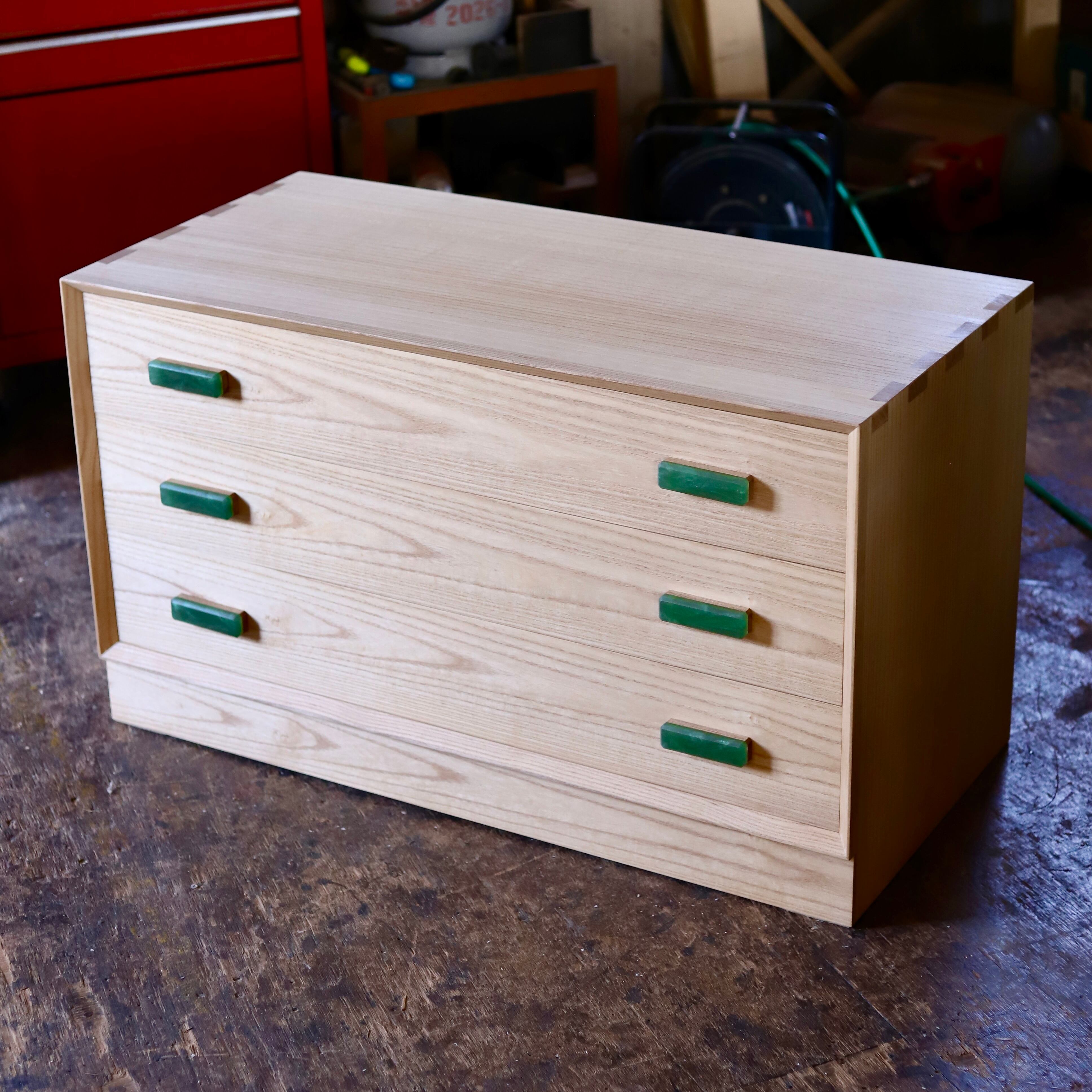 仕上げには柿渋とオイルを用い、桐箪笥本来の優れた調湿機能をそのままに、水滴が付いてもシミになりにくい実用性を加えました。さらに柿渋ならではの美しい経年変化を楽しむことができ、時を重ねるごとに深みを増していきます。