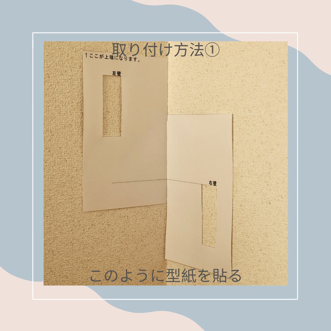 付属の金具(壁美人)を型紙に合わせてホッチキスで留めるだけで簡単に取り付けが出来ます。