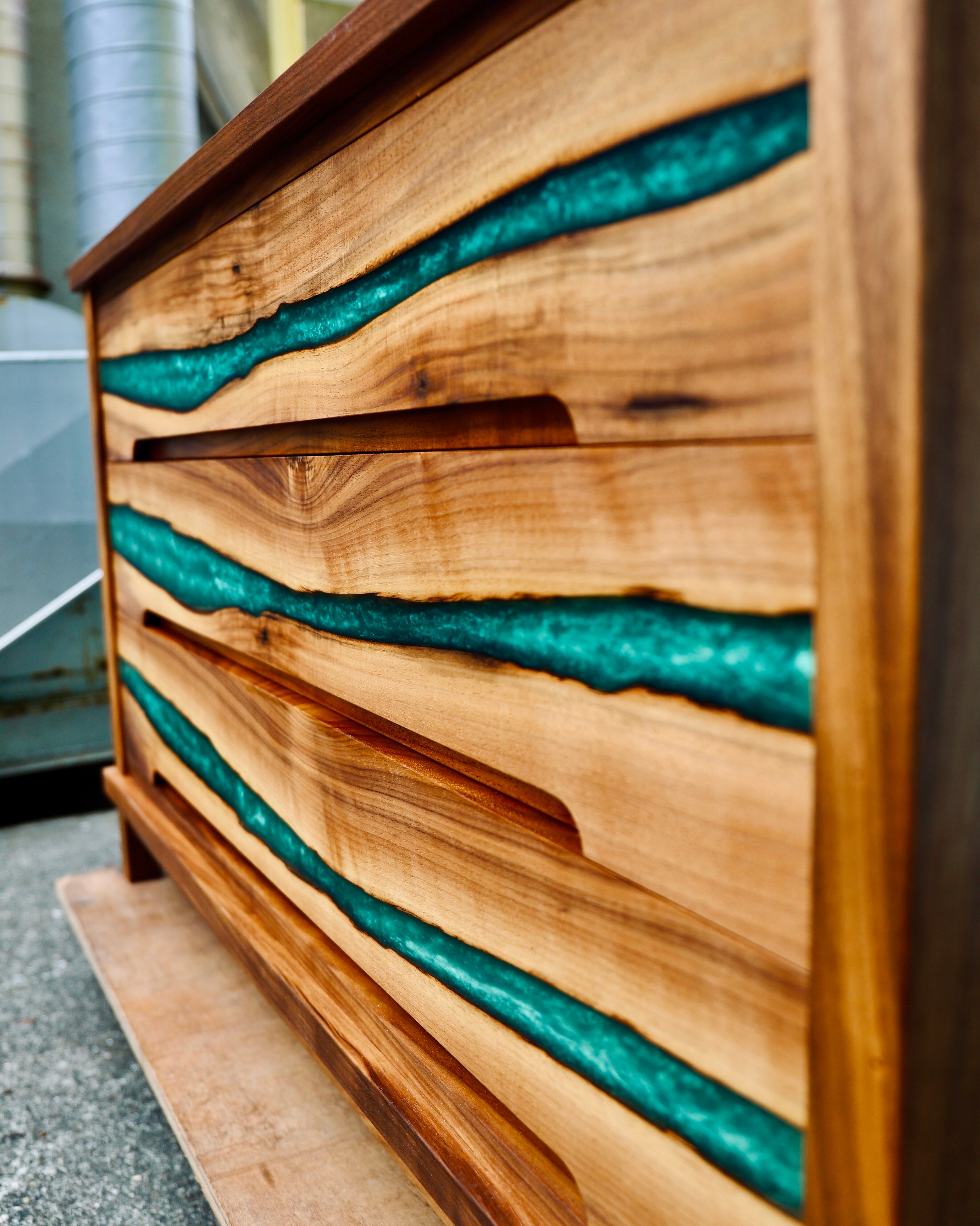 引き出しの前板にはハンターグリーンのレジンが使用されています。ハンターグリーンは落ち着いた色合いで、インテリアに豪華なアクセントを加えます。レジンの質感は、木材の温かみと見事に調和し、このチェストを特別なものにします。