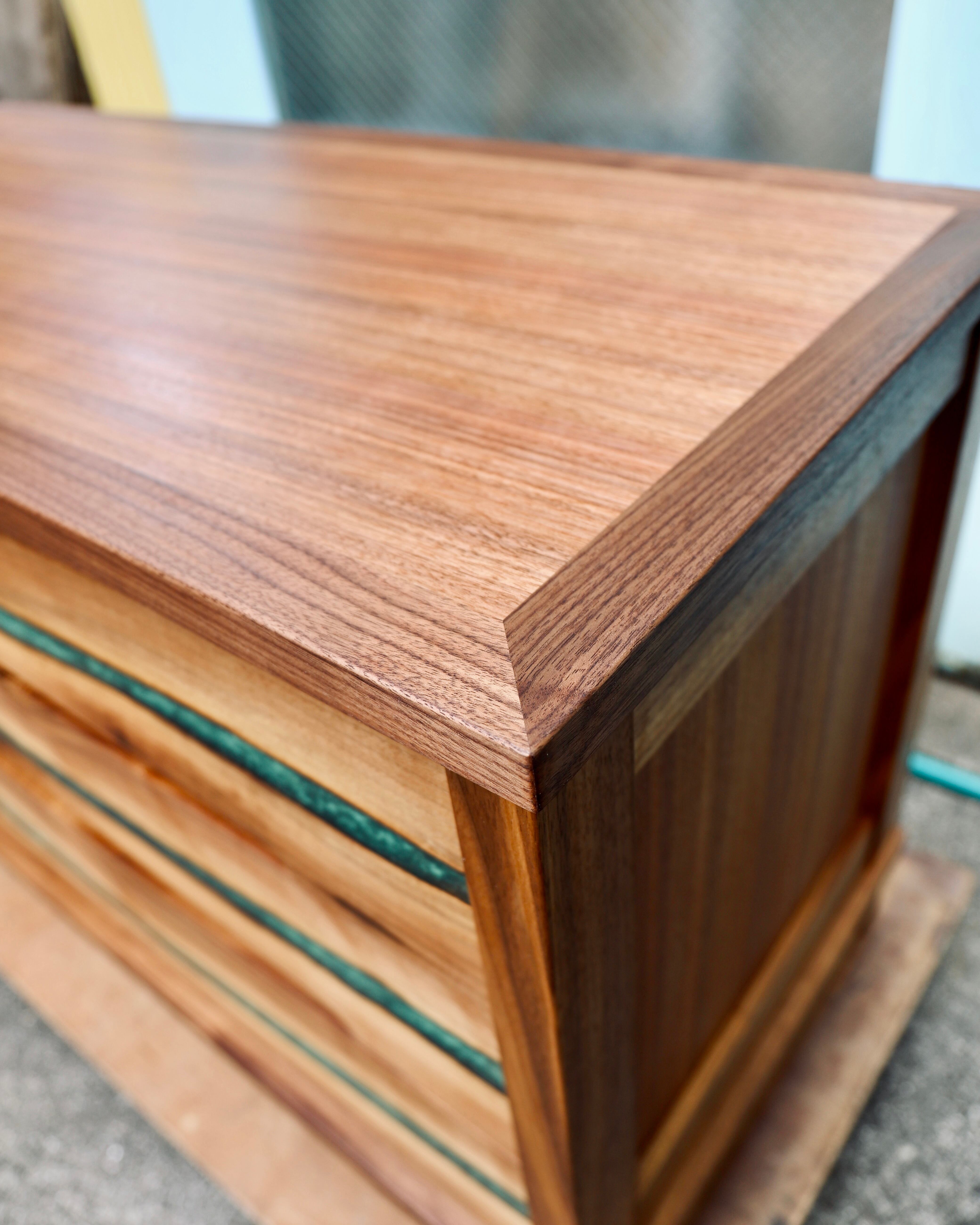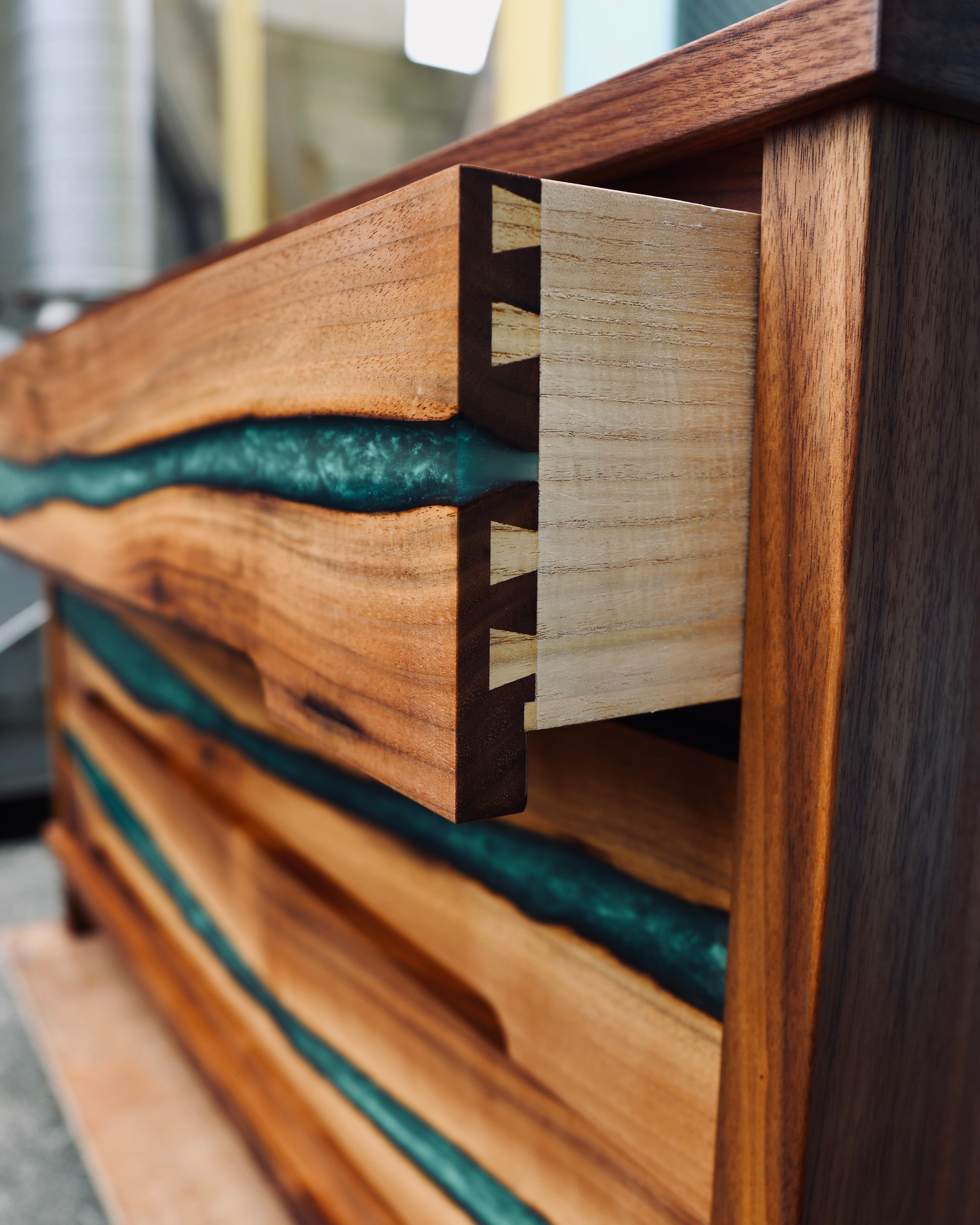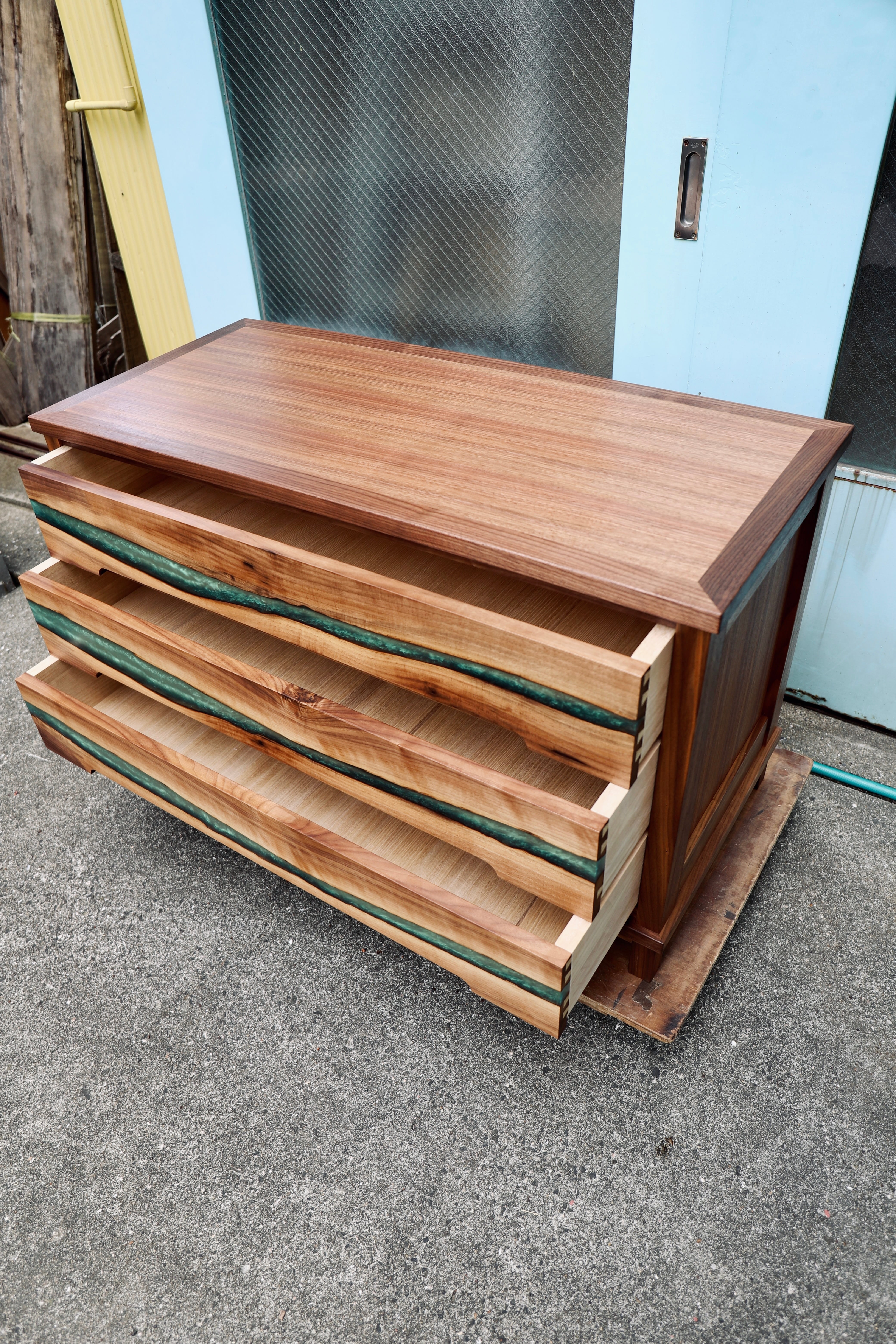 抽斗の前板はウォールナットとレジン(ハンターグリーン)、側板は桐でアリ組にしています。レジン部分に組手が入らないようににあえて外しました。